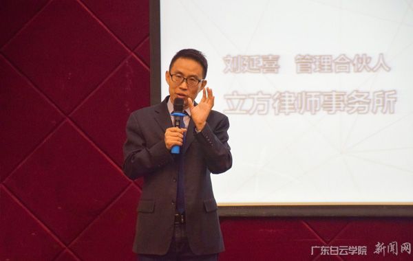 11月29日下午,白云大讲堂第156讲在儒学堂隆重开讲。我校邀请到北京市(广州)律师事务所管理合伙人刘延喜先生为我校学子做以大学生创新创业与知识产权修养为主题的讲座。