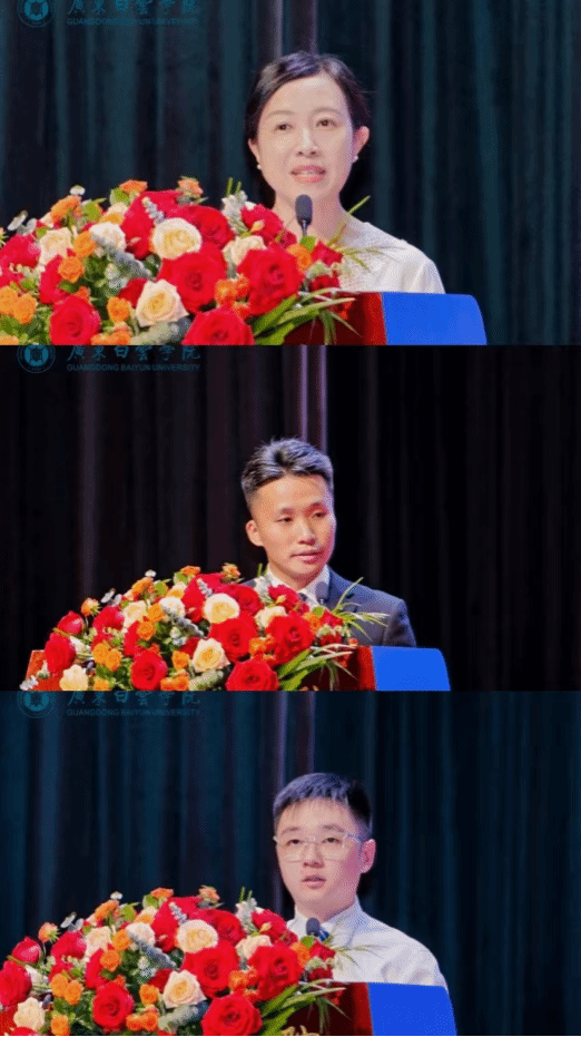 校友代表2022届校友王盈东毕业后成为一名广东高校毕业生志愿服务乡村振兴行动的志愿者。2023年当选广东省出席中国共产主义青年团第十九次全国代表大会代表并参会,同年12月,荣获共青团中央颁发的第十四届中国青年志愿者优秀个人奖。在发言中,他讲述了3年来志愿服务的初心和经历。3年间他走遍17个镇,从助农直播磕巴新手蜕变为方言交流能手,更带领少先队员拍摄宣传片引发40万网友共鸣。他用热鸡蛋比荣誉珍贵的故事印证:“小岗位能扛大担当。”呼吁毕业生向下扎根淬炼本领:“当青春与泥土芬芳交织,向上生长时必将触碰星光!”