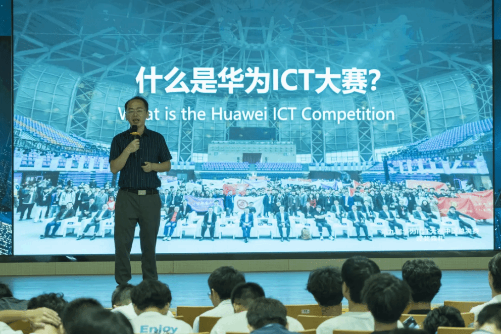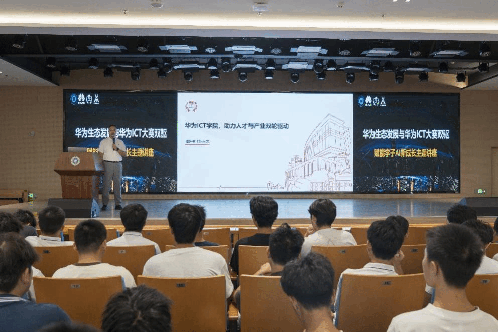 随后,华为ICT学院王新磊副院长详细介绍了华为 ICT 人才培养体系,其中涵盖提供一站式学习支持的在线平台、覆盖多领域的三级职业认证体系,以及设置多赛道的 ICT 大赛。他以 “华为 ICT 大赛:从校园到产业的桥梁” 为核心,梳理出 ICT 人才成长的三阶段路径,即入门期夯实专业基础并积累实践经验、成长期钻研专项技术以提升专业深度、成熟期向技术管理等高端方向拓展从而实现多元化发展,同时鼓励同学们以赛促学,借助华为 ICT 体系明确自身发展方向。