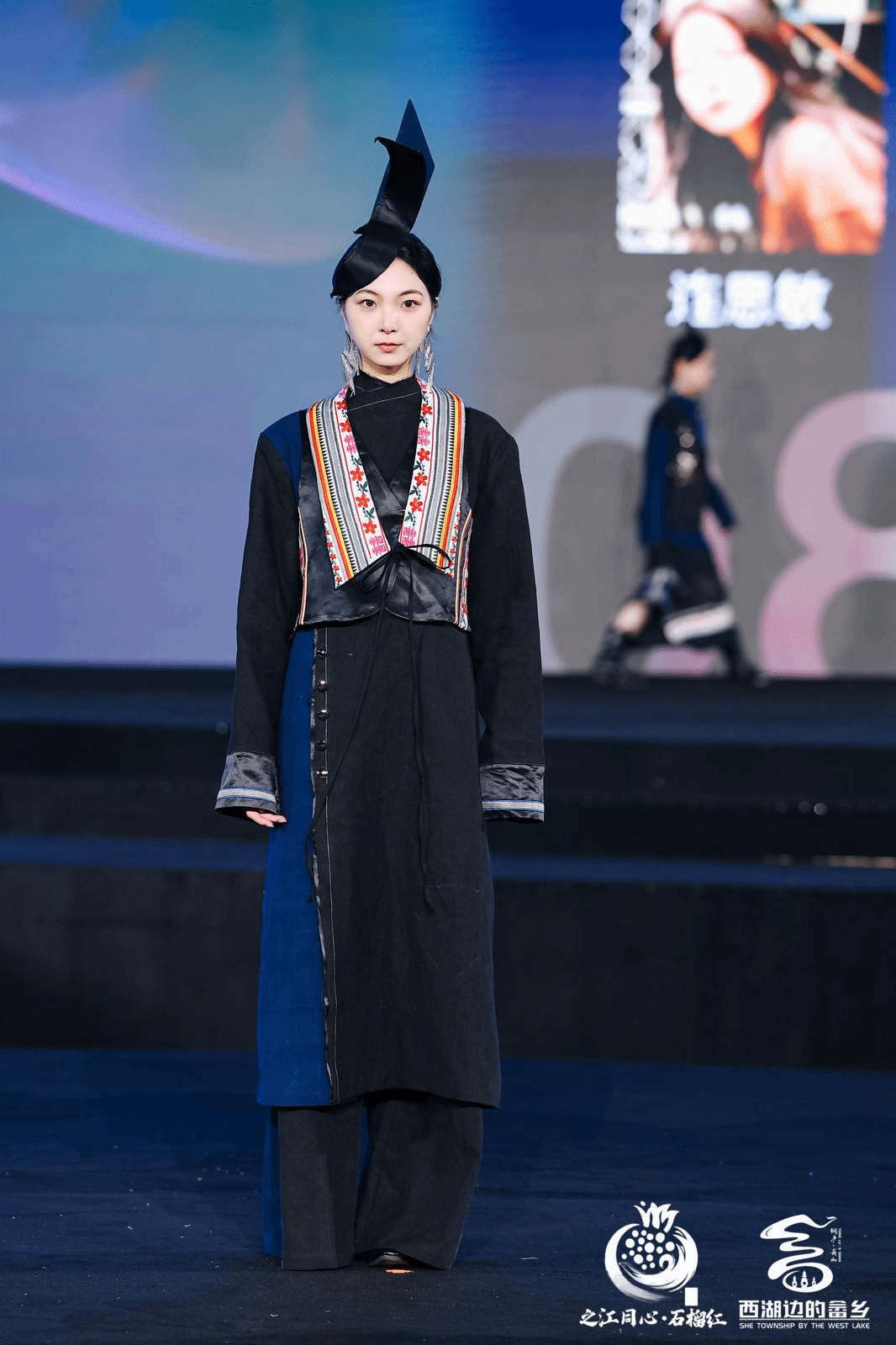 连思敏老师的获奖作品《畲凤归,山鸣》,深度挖掘潮州畲族服饰文化精髓,并巧妙融合浙、闽等地畲族服饰特色。作品将凤凰、花边衫等传统意象解构重塑于现代服装结构之中,并创新运用畲族传统手绣织带、土布等非遗工艺,以当代设计语言重新诠释了畲族文化的神秘与古朴。该系列不仅是传统技艺的精彩呈现,更是推动民族文化在现代语境下传承与创新的有力实践。