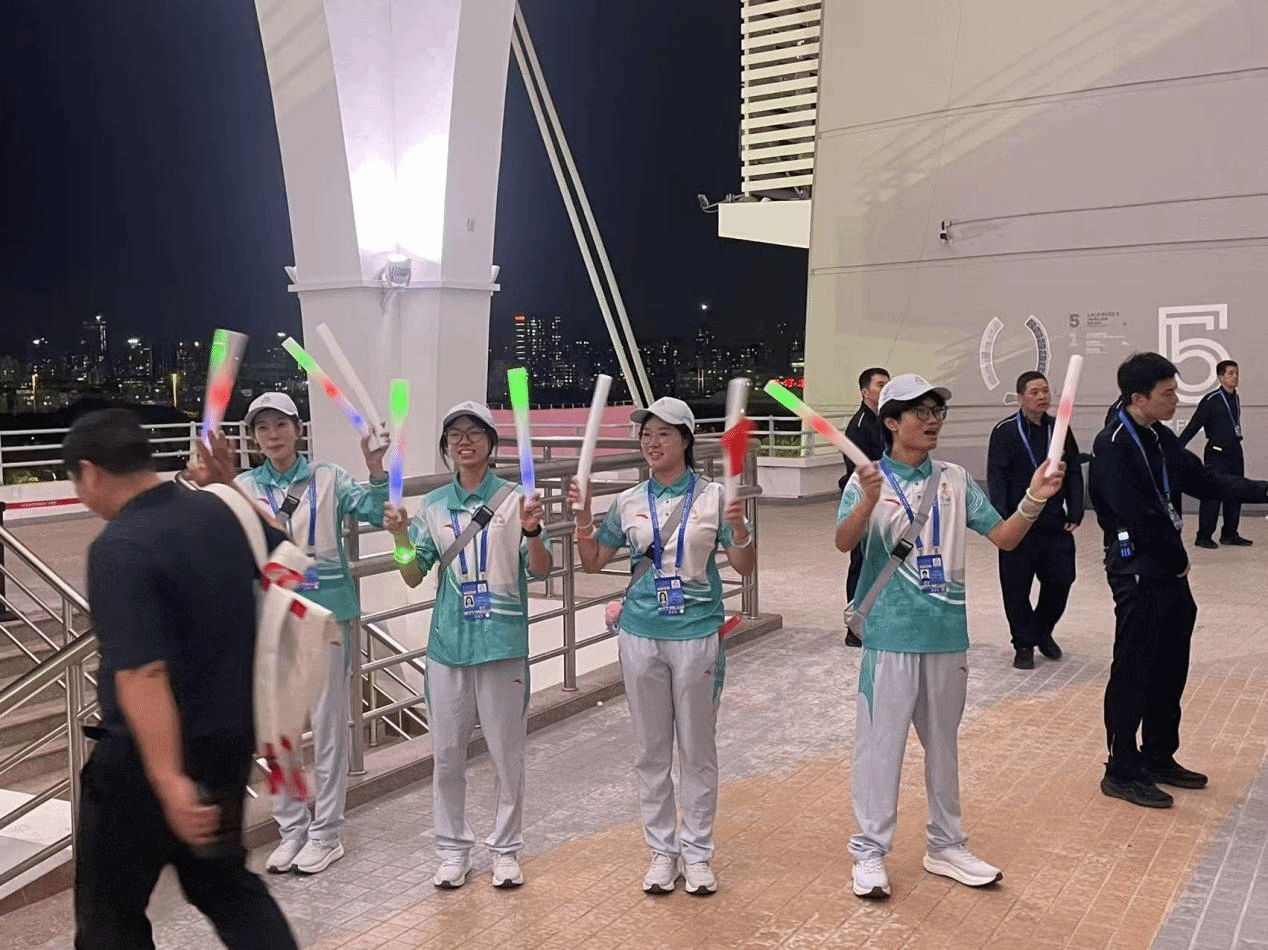 与此同时,另外10名同学负责中场区域的观众组织与服务工作。 从引导入场、维护秩序到解答问询,他们用真诚的微笑和细致的服务,又打造了一道青春活力的风景线。
