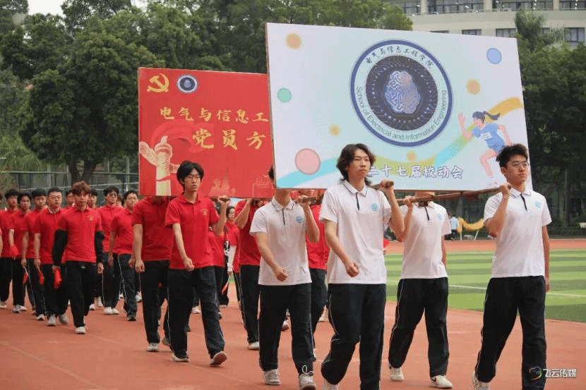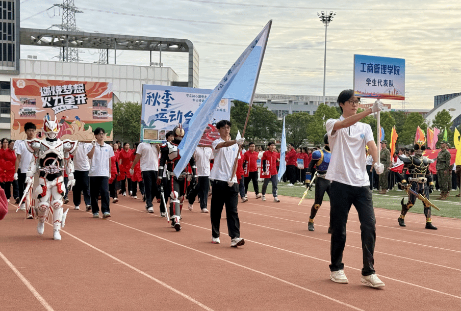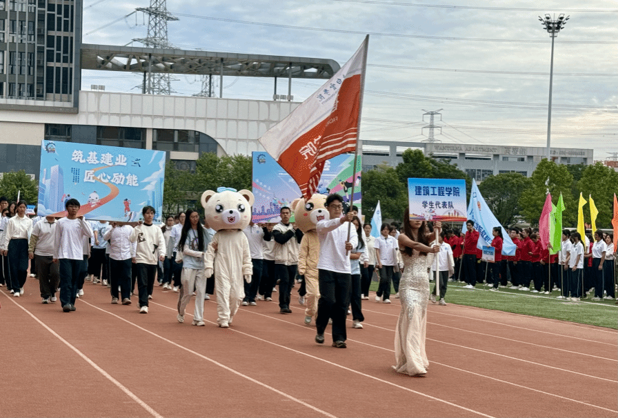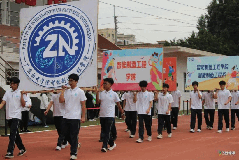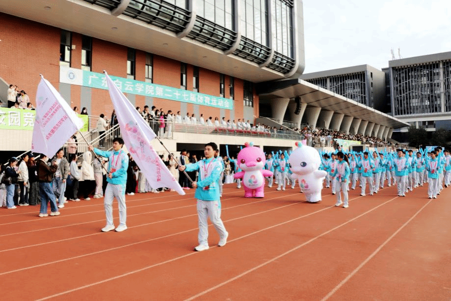 入场式正式开始。在激昂的运动员进行曲中,国旗队迈着铿锵有力的步伐率先入场,他们神情肃穆,姿态庄严。紧随其后的是校旗队、会徽队与彩旗队,色彩斑斓的旗帜在风中猎猎作响,展现出白云学子“恰同学少年,风华正茂”的昂扬风貌。值得一提的是,智能制造工程学院的“机器狗”在方阵前列指路,科技感十足,引来阵阵喝彩。曾服务第十五届全运会的“小海豚”代表组成方阵亮相,他们身着统一服装,精神抖擞,展现出白云学子积极参与国家盛事、延续服务精神的良好风貌。各学院代表队与教师方阵精神饱满、口号响亮,挥舞着创意十足的院旗与标语,展现出团结进取、奋发向上的精神风采,赢得看台上师生的热烈掌声。
