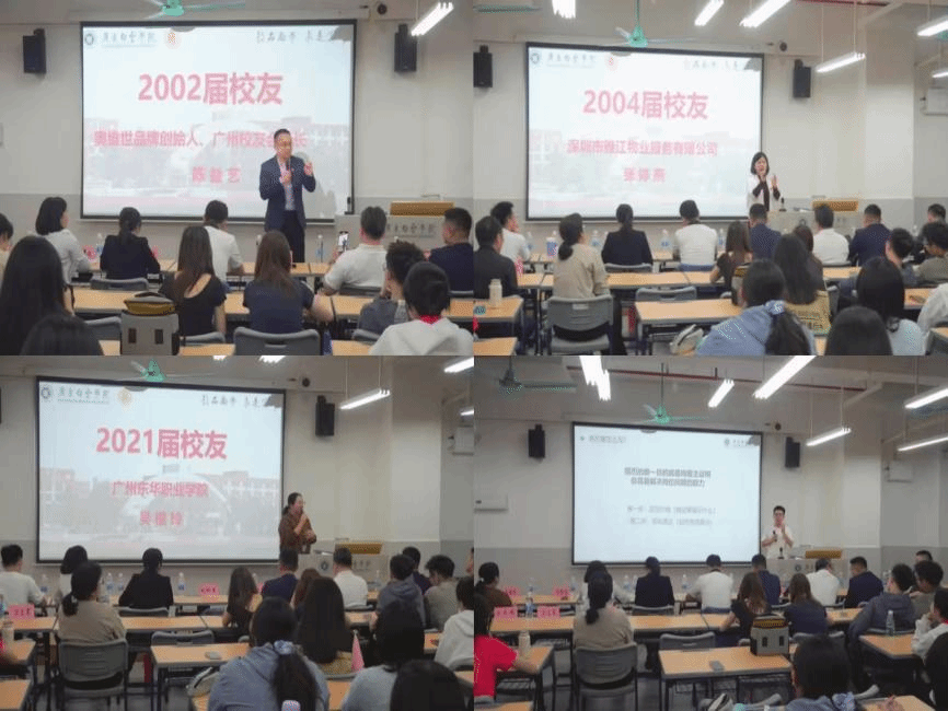 奥维世品牌创始人、广州校友会会长陈益艺以 “优秀是一种习惯” 为主题分享,结合自身经历传递就业观,强调“我不会,但可以学”的积极心态与责任内化的重要性,提出 “守诚胜百数” 的面试准则,建议提炼经历、锻炼逻辑与沟通能力。2004 届校友张婷燕聚焦职场共情能力,倡导换位思考,分享 “空杯心态” 与终身学习的价值。2021 届校友吴楷玲勉励学子扎实学业、勇于多元实践找准职业方向,保持谦虚成长。2024 届校友张敬圣针对市场营销专业,建议主动打破信息差,通过精准定位价值、挖掘优势打造差异化简历,提升就业核心竞争力。