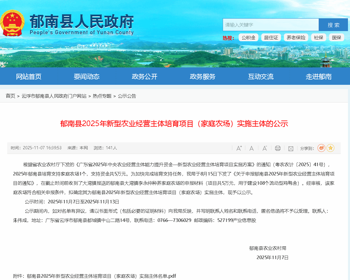 此次项目申报依据《广东省2025年中央农业经营主体能力提升资金—新型农业经营主体培育项目实施方案》(粤农农计〔2025〕41号)开展,郁南县共计培育支持1个家庭农场。郁南县农业农村局于8月15日启动项目申报工作后,大湾镇李永仲种养家庭农场在科技特派员团队的全程协助下,及时提交了高质量的申报材料。申报项目计划将5万元专项资金用于建设108个流动型鸡鸭舍,以改善养殖条件,提升生产灵活性与生态效益。经严格审核,该农场符合各项申报条件,被正式确定为2025年项目实施主体,并于11月7日至13日期间完成了公示。