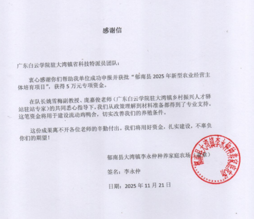 该笔专项资金的注入,将有力推动李永仲种养家庭农场基础设施升级与养殖模式创新,对示范带动当地新型农业经营主体培育、促进畜禽养殖业提质增效与农民增收具有重要意义。未来,广东白云学院科技特派员团队将继续发挥科技与人才优势,为郁南县乃至云浮市的农业现代化发展贡献更多智慧与力量。(图文/创新创业学院姚雪梅 责任编辑曾进)