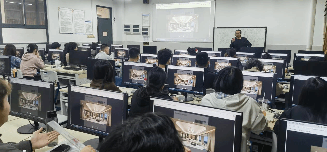 林杨耀导师则聚焦技术实操,围绕“线稿生图”“白模生图”“材质调换与家具更换”等核心技能展开系统讲授。通过逐步演示与实时指导,学生迅速掌握AI辅助设计的关键流程与控制技巧。课堂练习环节,学生积极参与、踊跃尝试,在教师与企业导师的共同指导下,完成了一系列高质量的设计草图深化与效果图生成练习,真正实现了“学中做、做中悟”。