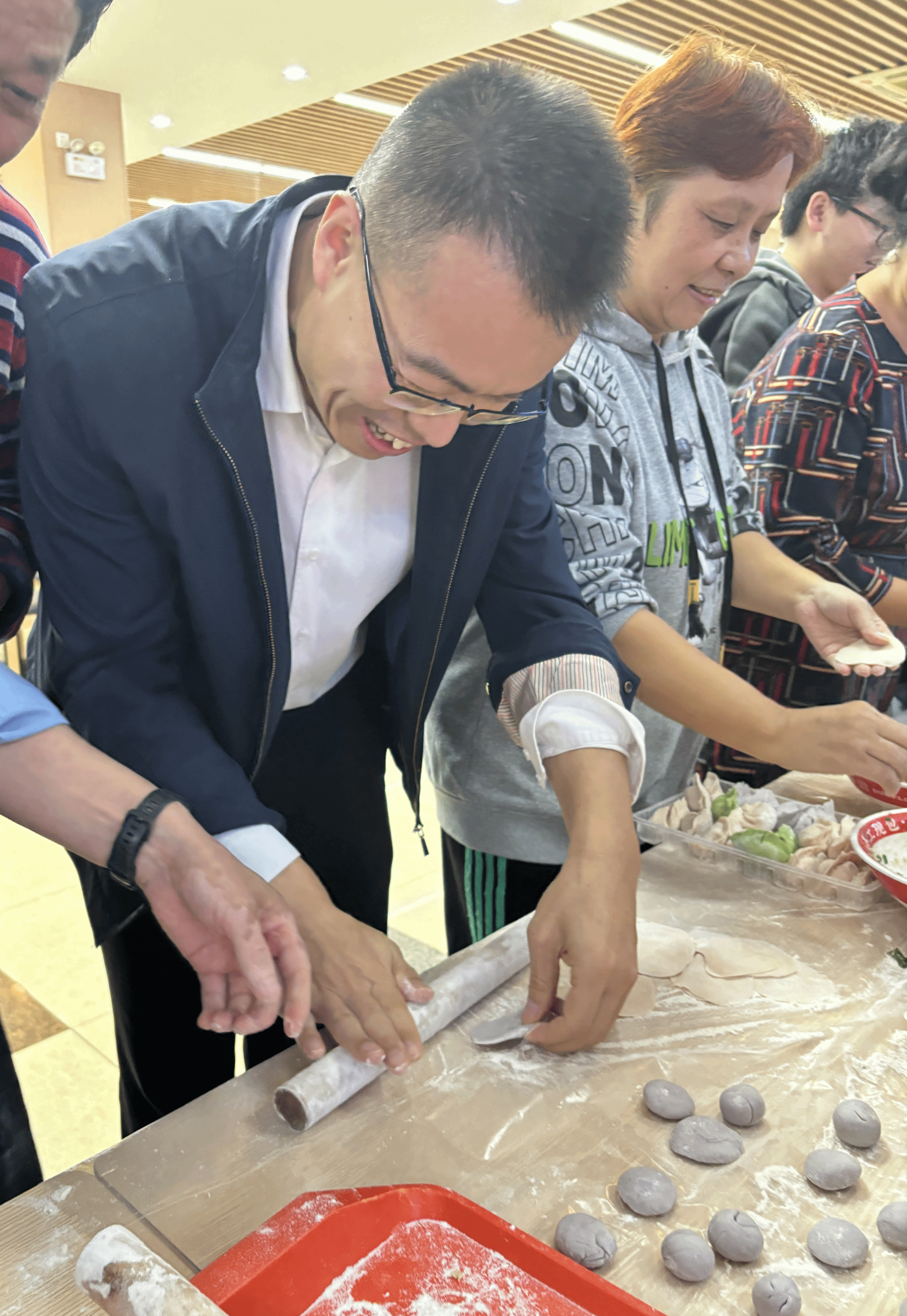活动现场热闹非凡,饺子皮、玉米猪肉馅、韭菜猪肉馅等食材分门别类整齐摆开。学校党委副书记、副校长、工会主席陈峰,校长助理柳贵东也亲临现场,与师生们一同参与活动。在食堂工作人员的指导下,师生们纷纷动手,取皮、填馅、捏褶,一个个动作有条不紊,忙得不亦乐乎。大家围站在桌前,有的手法娴熟,很快就捏出圆润饱满的饺子;有的初次尝试,在同伴的帮助下也渐渐找到窍门,形态各异的饺子摆满了托盘,整个现场洋溢着欢声笑语。