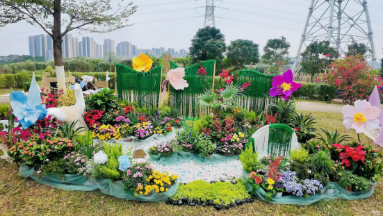 本次展出的10组作品以自然意象、文化符号、植物艺术等为导向进行设计构思。融合广绣纹样、满洲窗、竹编技艺等非遗符号,通过植物季相搭配、艺术装置与材料创新,实现“传统符号+当代艺术”的跨界表达。作品选用三角梅、麦冬等乡土植物构建生态基底,辅以鬼针草、薇甘菊等外来物种丰富空间层次,精准把控植物生长习性、季相色彩与空间营造规律,将植物生态特性、岭南文化与艺术创意深度融合。同时贯彻“低碳营造”,运用皱纸花形装置、旧瓦片铺路等低成本技术降碳,锤炼动手能力并厚植生态责任感,成为思政教育与专业教学融合的典型范例。课程负责人常云凤进一步指出:“微花园营造需兼顾‘形’的艺术表达与‘魂’的文化内涵”,未来将持续探索“在地性设计”与“可持续营造”的创新融合路径,深化课程育人内涵。