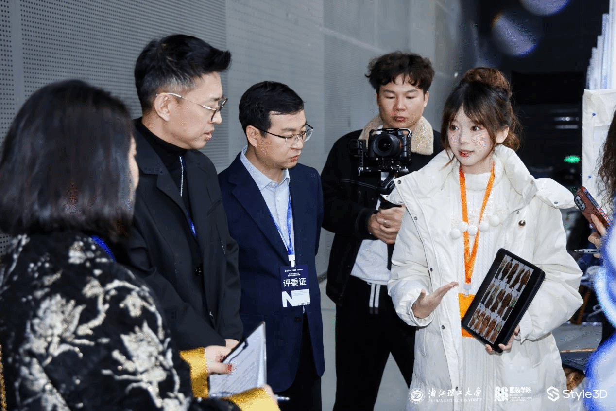 我校选手向中国服装协会专职副会长/中国服装科创研究院院长杜岩冰、中国美术学院陶音教授、浙江理工大学邹奉元教授等专家介绍系列设计方案