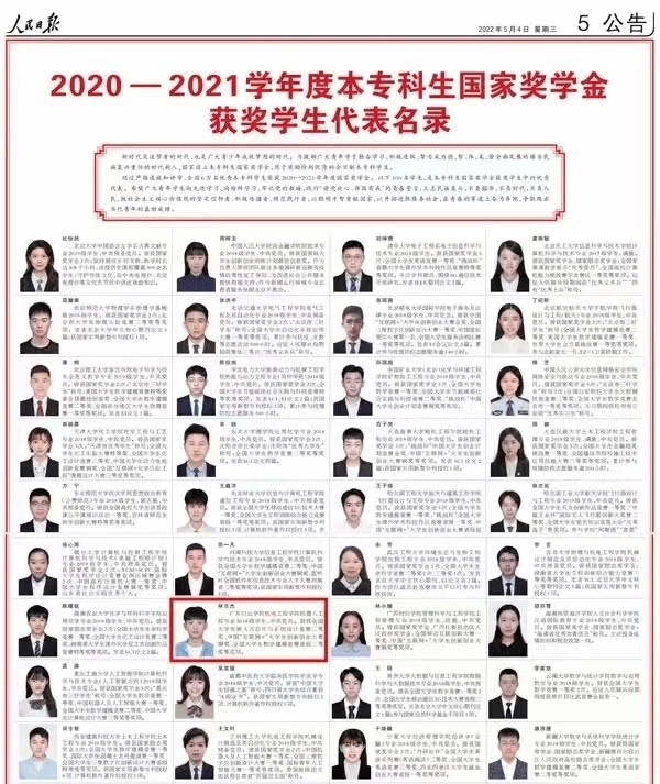 2020级机器人工程专业学生林志杰入选《人民日报》刊登的本专科生国家奖学金获奖学生代表名录