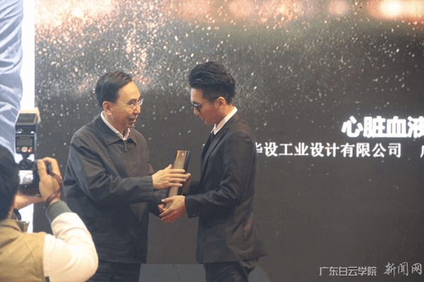 校友陈大鹤带领大四实习生赵达源、何贤宝等人研发的医疗概念作品 《心脏血液循环辅助设备》获第八届“省长杯”工业设计大赛概念组最高奖项“钻石奖”,图为省长朱小丹(左)为陈大鹤同学(右)颁奖