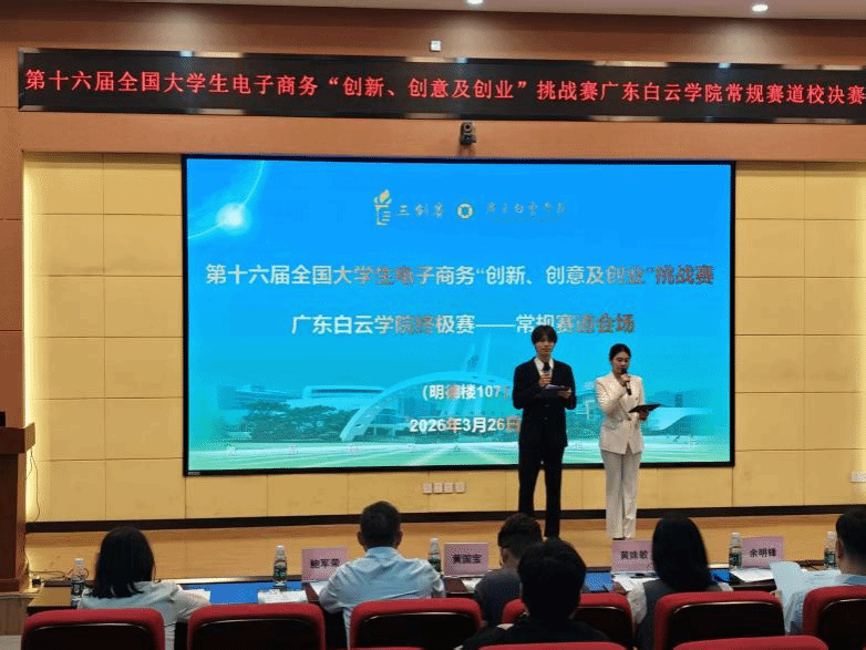 2026年3月26日下午,第十六届全国大学生电子商务“创新、创意及创业”挑战赛(简称“三创赛”)广东白云学院常规赛道终极赛在北校区明德楼107教室隆重举行。本次大赛由创新创业学院主办,旨在激发大学生兴趣与潜能,培养创新意识、创意思维、创业能力以及团队协同实战精神。