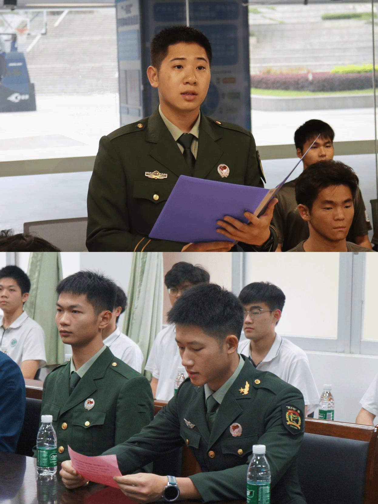 在会议中,退役复学大学生代表阮振宇、谢鹏先后发言。他们深情回顾了军营岁月中的磨砺与成长,分享了从迷彩绿到校园蓝的心路历程。他们表示,正是部队的培养让自己真正懂得了责任与担当的意义,回归校园后将倍加珍惜宝贵的学习机会,把军人的拼搏精神带进课堂、融入生活,并积极投身学校国防教育和征兵宣传工作,以实干回报母校、服务社会。