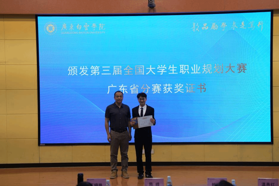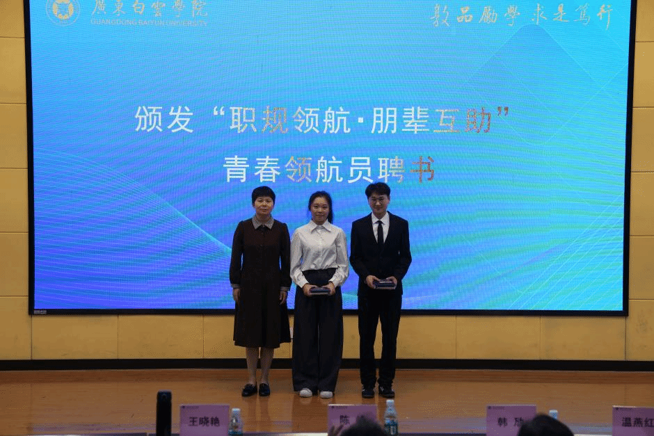 仪式上,陈峰副校长为第三届全国大学生职业规划大赛广东省分赛获奖学生颁发证书。就业指导中心王晓艳主任为首批“青春领航员”颁发聘书。首批受聘学生将作为朋辈互助营的核心力量,在后续系列分享活动中为同学们带来成长经验和职业规划指导。