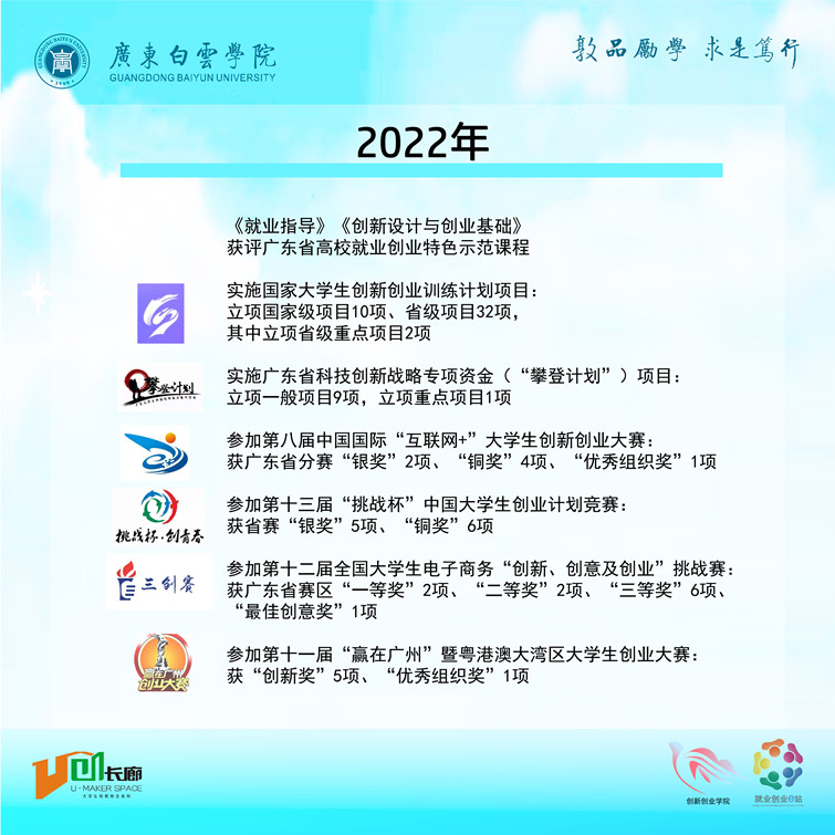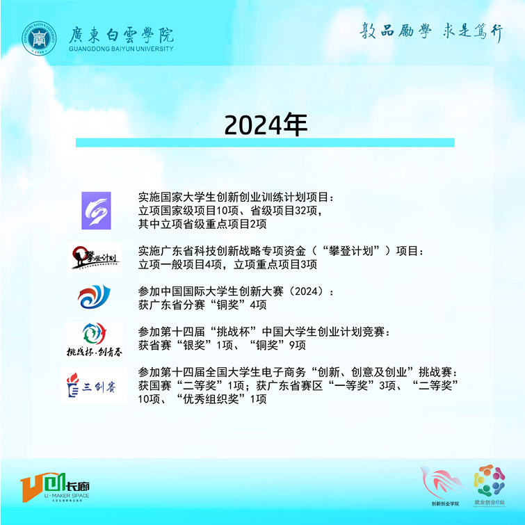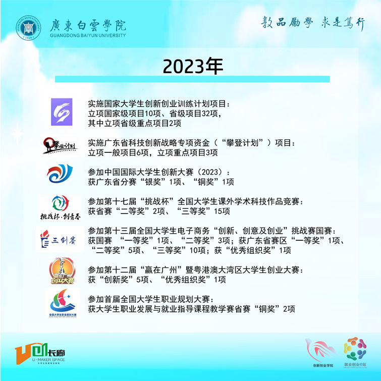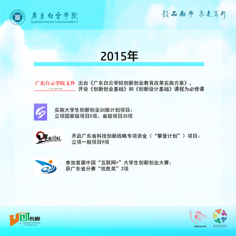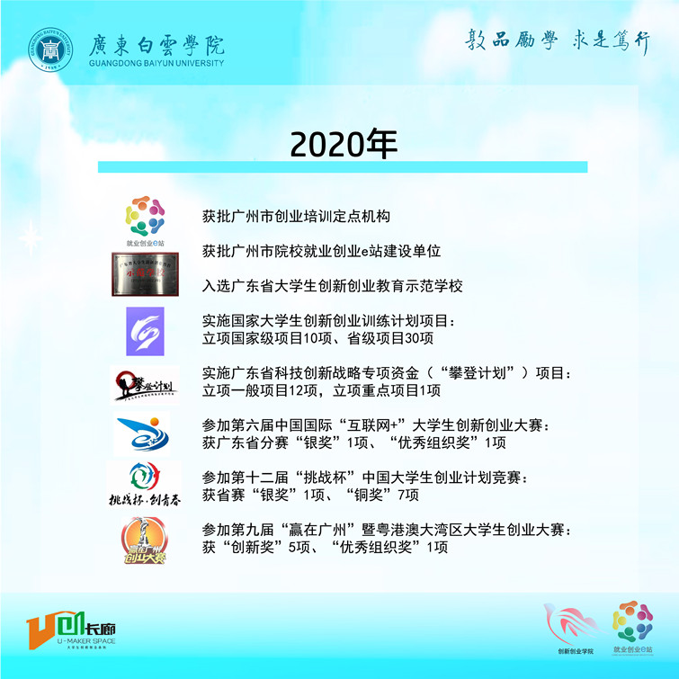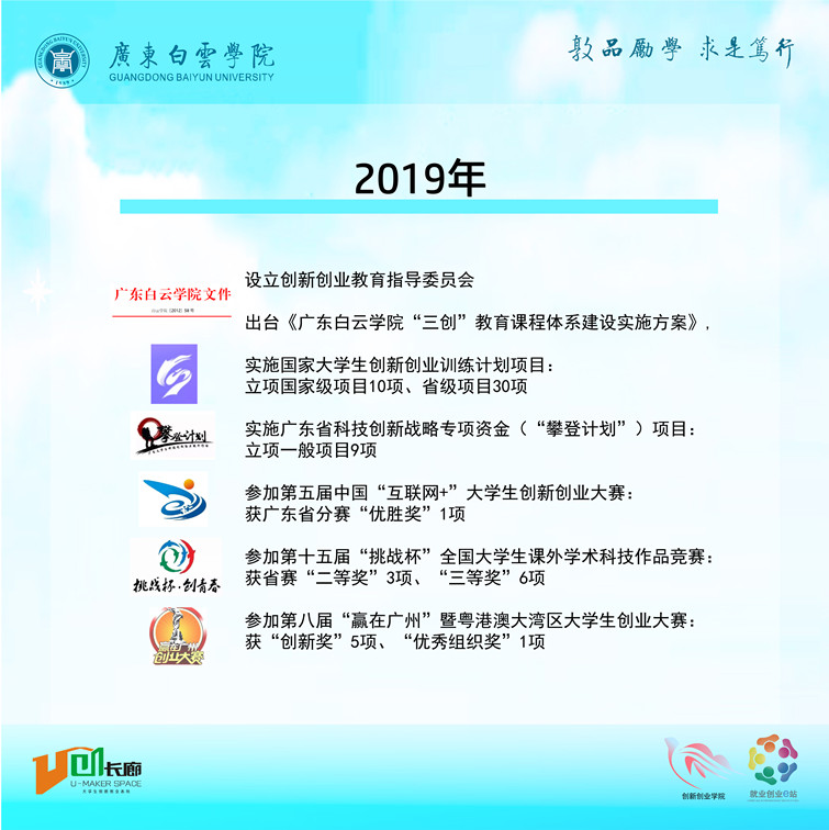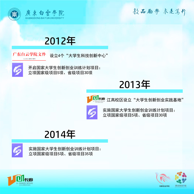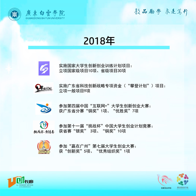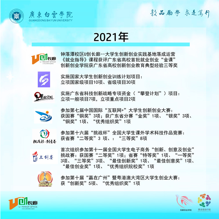 经过初期探索,学校将创新创业教育工作纳入中长期发展规划,2016年成立创新创业学院,设置二级学院大学生创新创业中心,将大学生创新创业基地(U创长廊)扩建至4000平方米,把建设广东省创新创业教育示范学校列入学校“十三五”规划目标。